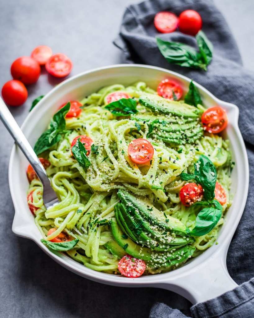 - In a blender or food processor, combine avocados, basil, garlic, lemon juice, salt, and pepper until you achieve a smooth and creamy consistency.